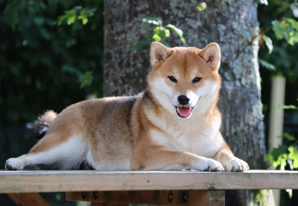 Okuura est issue de notre première portée entre Myoko et le célèbre Sparrow. Nous avons eu un coup de cœur pour elle dès sa naissance, et celui-ci s’est confirmé au fil des semaines. Okuura est une femelle de grand gabarit, à la construction osseuse. Elle a une jolie tête avec un crâne bien large un petit museau et un stop bien marqué. Elle a de jolis yeux en amandes et toujours une expression « souriante ». Mais ce qui caractérise vraiment Okuura, c’est sa douceur de caractère et sa gentillesse. C’est la chienne la plus équilibrée et facile à vivre que j’ai connue, toutes races confondues. Elle n’a d’ailleurs aucun « défaut » que l’on associe généralement aux Shiba : elle adore tous les humains, s’entend avec tous les chiens, a un super rappel et suivi, et n’a absolument aucun instinct de prédation (au point qu’elle peut même avoir des rongeurs entre les pattes sans avoir la moindre réaction). Okuura, c’est un peu l’exception de la règle des Shiba…