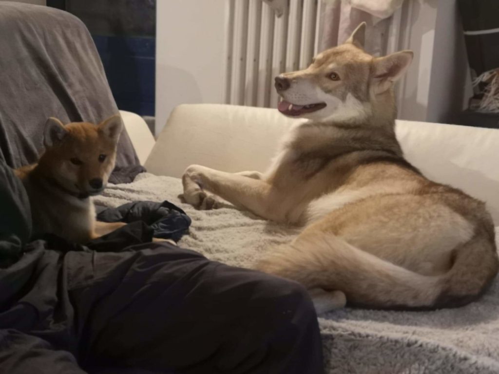 Gossip (notre première chien-loup de Saarloos, fondatrice de notre élevage) et Ryuk, notre mâle Shiba